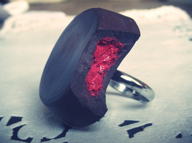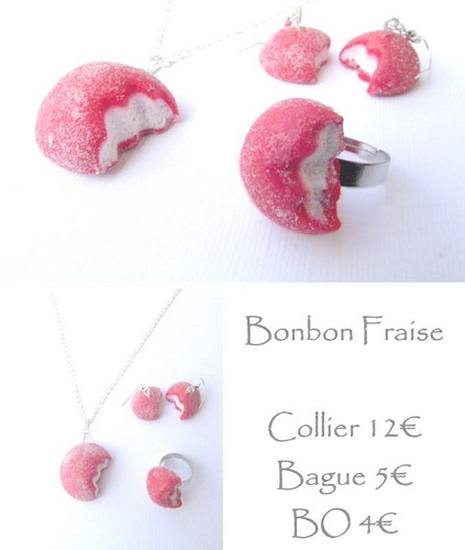 J’ai commencé la fimo à la naissance de mon fils, il y a de ça deux ans et demi car j’avais décidé de prendre un congé parental de trois ans mais je m’ennuyais beaucoup. Une amie m’a parlé de ses bijoux gourmands et je me suis lancée moi aussi dans la création, pour le plaisir d’abord puis comme un défi en essayant de les vendre. Aujourd’hui, ça marche plutôt bien.